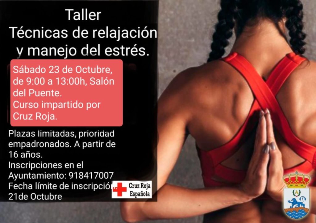 El sábado 23 Cruz Roja impartirá un taller de técnicas de relajación y manejo del estrés. Anímate a participar, recuerda que debes inscribirte en el Ayuntamiento