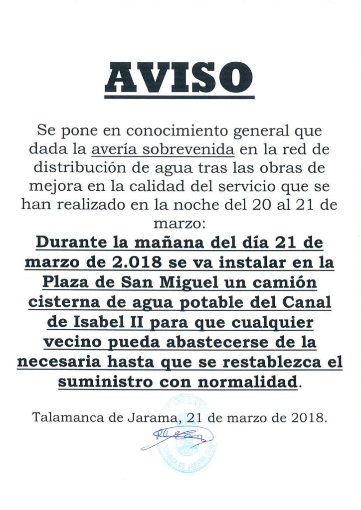 AVISO CORTE DE AGUA DESDE LAS 22:00 h del 20 de marzo hasta las 8:00 h del 21 de marzo
