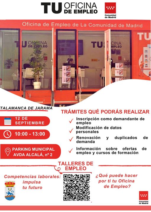 Oficina de Empleo Móvil en Talamanca de Jarama 12 de septiembre en el parking municipal en la Avd. Alcala, en horario de 10 a 13 h. Si estás interesado en talleres de empleo escanea el QR o pincha en el siguiente enlace y completa el formulario; https://forms.office.com/e/gsPbTJ5NBg